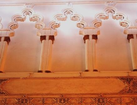 Aun estando en un país como éste, en el que hasta tiempos recientes ha sido una tradición maltratar muchos de sus edificios más emblemáticos, no deja de asombrarme la variada historia de esta sinagoga, mientras paseo por sus cinco naves y voy recreándome en sus motivos decorativos. Quizás fueron gentes venidas de Al-Andalus las que labraron estas yeserías geométricas, con su repertorio de roleos, medallones y pequeñas palmetas, todo ello a ritmo constante, que remite a los motivos predilectos del arte almohade. Tanto como los arquillos polilobulados de más arriba, con sus basas y pequeños capiteles pintados a la almagra, o los dos arcos túmidos que en las naves laterales franquean el acceso a la cabecera. Al mismo origen apuntan los capiteles, que poseen aquí una estricta función decorativa, ornados ellos mismos con un repertorio de piñas, volutas y cintas. Los recorro uno a uno: la labra artesanal permite apreciar pequeñas diferencias en detalle.